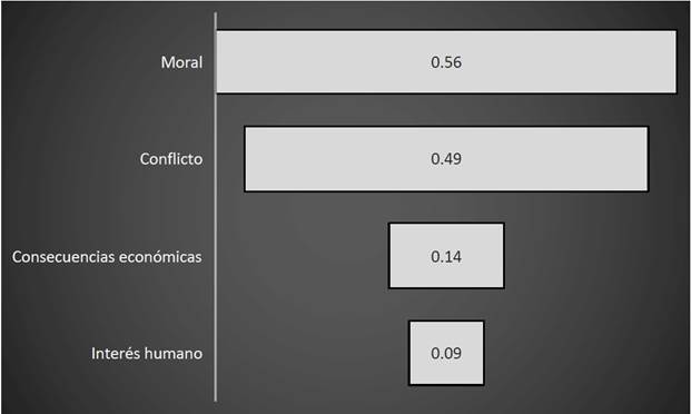 Del análisis de los encuadres, los cuáles se miden en términos de presencia o ausencia en el marco de las piezas informativas, se desprende que el frame de moralidad fue el que más se utilizó para moldear el tema. El hallazgo, expresado en el gráfico 7, supone que los medios de comunicación mayormente presentaron la información a partir de una explícita carga afectiva, moral y evaluativa, lo que se aleja de la pretensión de objetividad y ecuanimidad en el tratamiento de la información. En contextos sociales fuertemente polarizados es posible que la preponderancia de la opinión por sobre la información sea un rasgo constitutivo de la noticiabilidad puesto que, como demuestran diversos estudios (Festinger, 1957; Kiousis, 2004; Trilling et al., 2017), la editorialización explícita desencadena procesos de identificación basados en los acuerdos cognitivos previos de los lectores, lo que le aseguraría a los medios estabilidad de los contratos de lectura y captación de la atención pública.