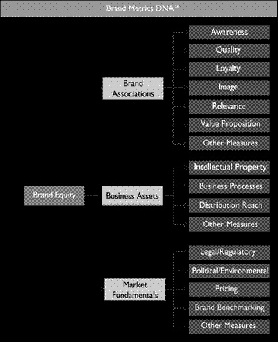 For its part, the consulting firm Brandz identifies the components of brand equity with its Brand Metrics DNA (Figure 2). In this model, three dimensions make up perceived brand equity: (1) brand associations (awareness, quality, brand loyalty and image, relevance and value proposition, and other measures), (2) business assets (intellectual property, business processes, distribution reach, and other measures) and, finally, (3) market fundamentals (legal and regulatory aspects, political and environmental, pricing, brand benchmarking, and other measures).