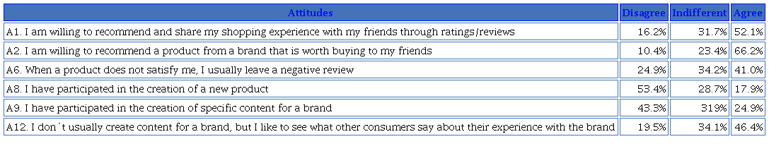 Based on previous work by Carcelén and Diaz-Soloaga (2022), and as shown in Tables 1, 2 and 3, a high percentage of respondents show a favorable attitude towards the co-creation processes when they are linked to eWOM: 66% are willing to recommend a worthwhile brand (A2), and 52% to recommend and share their shopping experience (A1). This percentage decreases slightly when related to leaving a negative review if the product failed to meet their expectations (A6) (41% agree with this statement compared to 24.9% who responded the opposite and 34.2% who were indifferent).