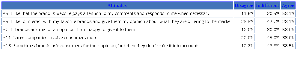Regarding the variables related to the eWOM interaction process created between a company and its target public (A3, A5, A7, A11 and A13), it should be noted that almost 60% of respondents like to be considered and to be listened to by brands and they also want companies to respond to them when they need it. Almost 60% are happy to interact with a brand and give their opinion; however, only 28% say they like interacting with a brand and giving their opinion when asked for it (anonymous, 2022).