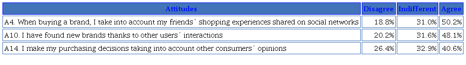 Finally, as seen in the previous work of anonymous (2022), when analyzing the association between eWOM and the process involved in the decision to purchase from a brand, 40% of those surveyed indicate that they make their purchase decisions based on other consumers’ opinions (A14). This percentage increases to 50% when the opinion is found on friends’ and acquaintances’ social networks (A4). In addition, thanks to other users’ interactions with certain brands, new products reach new consumers (almost 50% of those surveyed came across new brands based on other users’ comments A10).