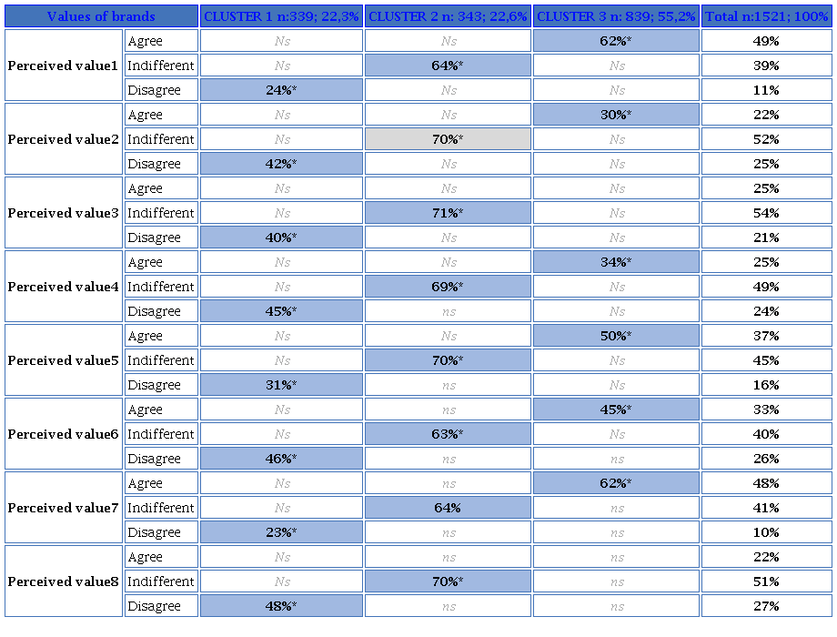 Regarding the research methodology, univariable descriptive techniques were applied, as was the multivariate technique called multiple correspondence analyses (MCA) to co-creation attitudes. In order to identify clusters, a cluster analysis of the factorial coordinates obtained in the MCA was then carried out, followed by a mixed analysis, which resulted in a high number of initial clusters (K-means, Euclidean distance), and hierarchical analysis (Ward’s method, Euclidean distance). A break in the partition hierarchy was made when inter-cluster variability significantly decreased as a new partition was formed. The clusters obtained were described using attitudes towards co- creation, as well as assessments of brand perception with the highest representation with respect to the total set when the hypothesis of a random distribution of respondents to the clusters is rejected (approximation of hypergeometric distribution to the normal distribution). The level of significance was set at p <0.05.
