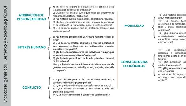 Este estudio trabaja con los encuadres genéricos en función de la tipología propuesta por Semetko y Valkenburg (2000). Las autoras identifican cinco encuadres que podrían presentarse en cualquier texto noticioso: el encuadre de conflicto, centrado en el desacuerdo -ya sea entre instituciones, grupos o individuos-; el de atribución de responsabilidad, en el cual se le asigna la responsabilidad por el problema o su solución a una institución, grupo o individuo; el encuadre de interés humano, que desarrolla un tratamiento emocional o se centra en el rostro humano del asunto; el de moralidad, que prescribe cuestiones morales o religiosas; y el de consecuencias económicas, que presenta al problema en cuestiones económicas que se deberán afrontar.
