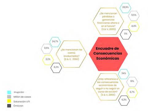 Por otra parte, si bien las variables que integran el encuadre de consecuencias económicas no presentan valores significativos dentro de los períodos analizados, se observa que durante la irrupción se registran levemente más presentes que en los cortes posteriores, en coincidencia con los pronósticos referidos al impacto que el confinamiento podría tener en la economía, una de las primeras dicotomías (salud economía) que se configuró alrededor del asunto (Becerra, 2020). De esta manera, las variables referidas a las ganancias y pérdidas, los costos y las consecuencias económicas tuvieron mayor presencia en el período de la irrupción y luego se fueron desdibujando conforme las actividades económicas volvieron a su flujo habitual.