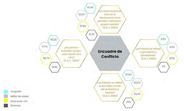 Los indicadores que conforman el encuadre de conflicto, que resalta la disputa entre individuos, grupos y/o instituciones, tampoco resultan predominantes en las coberturas analizadas. No obstante, si se comparan los períodos entre sí, la irrupción registra un mayor foco en conflictos o desacuerdos entre actores, conforme la imprevisibilidad y la incertidumbre que disparó la pandemia en sus inicios en relación con qué acciones tomar de manera inmediata.