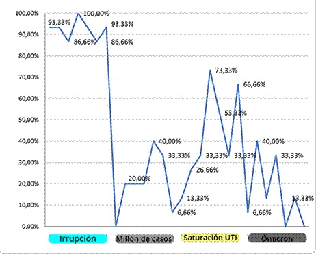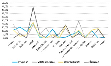 En relación con el indicador de rostro humano del asunto, se destaca que en el cuarto recorte temporal aparece como más prominente (44%), en coincidencia con la expansión de la variante Ómicron.