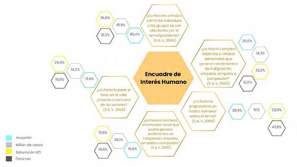 Del mismo modo, las variables que conforman los frames de interés humano y de moralidad resultaron más predominantes en el momento de la irrupción, aunque fueron diluyéndose con el paso del tiempo. Así, dieron paso a que primaran los aspectos individuales del asunto, pasando de definirse como un problema cuya solución se le atribuía al Gobierno Nacional, a desplazarse hacia la resolución particular de cada persona.