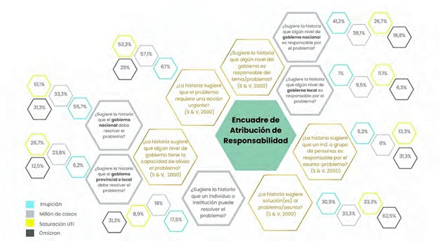 En relación con las variables que componen el encuadre de atribución de responsabilidad, este trabajo desagrega la variable que indica si en la noticia se le atribuye la responsabilidad de resolver el asunto a algún nivel del Gobierno en dos indicadores distintos: una focalizada en el Gobierno Nacional y otra en los gobiernos provinciales y/o locales (hexágonos en gris en la Imagen N°5); dado que ambos fueron parte de la formulación y ejecución de protocolos sanitarios, así como de otras medidas vinculadas con la pandemia.
