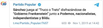 At a third level, the data reveals that political actors use Telegram to attack their political opponents (13.9%) and, complementarily, to share their political proposals (11.6%) (Table 5). In terms of criticism, it is directed toward the Government and its president Pedro Sánchez. This resource is used by opposition parties, especially the PP (9.5%) (Table 5) (Image 2). These attacks are directed at the leaders of rival parties to weaken their candidacy and discredit their figure.