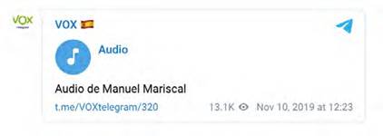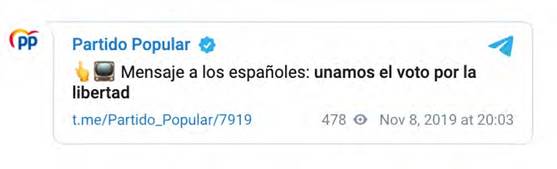 The sample refers to the general elections campaign held in Spain on November 10, 2019. For the first time in a Spanish electoral campaign, it has been observed that the Telegram platform acquired a significant role as an electoral campaign tool in the communicative activity of political parties.