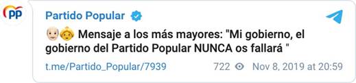 First, the data reveals that the parties mainly use Telegram as a repost or re-diffusion tool (19.6%) (Table 5). The messages that fulfil this function are imported directly from other social media. This reveals how this application is employed to re-diffuse content published in the parties’ accounts in other digital platforms. These messages have not been edited for broadcast on Telegram, so their visual design is that of the original network from which they come. This fact indicates low efficiency in communication terms. The parties use Telegram to extend the reach of the publications they make on social media such as Twitter or Facebook thus reaching a wider audience. The PSOE is the one that uses this function the most in its messages on Telegram (15%) (Table 5) and does so mainly through Twitter reposts to give greater diffusion to the coverage of party campaign events or leaders statements leaders in the media (Image 1).