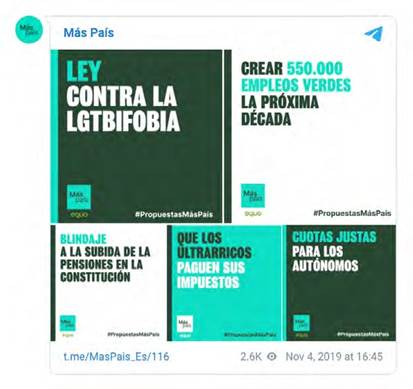 On the other hand, the number of messages disseminated by the Spanish political parties about their electoral program also stands out (11.6%) (Table 5, Appendix A1). They use Telegram as an informative brochure of the electoral campaign to display some promises that they will deliver in case they are elected to govern the country. As the party in government, the PSOE shares the most content with this function (5%). The party usually shares short messages along with the campaign image of Pedro Sánchez, introducing some of their electoral proposals, mainly on issues of social policy, education, health or pensions.