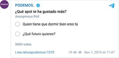 With the incipient use of this type of resources, political parties seek to foster closeness with citizens since gifs and audios are elements commonly shared in chats between friends or family. Thus, the parties seek to deinstitutionalize relations with their followers while considering their opinions in the party’s decision-making through their followers’ responses in the polls. Despite its limited use, this is a differentiating element of Telegram in comparison to other social media in campaigns.