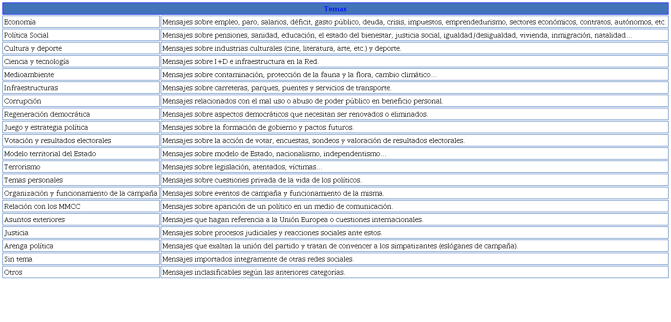 The possibilities that social media offer to create and disseminate messages have led these to become preferential spaces for political actors to set their thematic agenda, thus avoiding the traditional filter of legacy media (Alonso-Muñoz & Casero-Ripollés, 2018; López-López & Vásquez-González, 2018). Therefore, by spreading their themes and approaches, they manage to draw the attention of citizens and condition political debate and public opinion (Baviera, Calvo & Llorca-Abad, 2019). In this regard, much of the previous literature indicates that, in general, social networks have become bulletin boards for campaign events (Zugasti & Pérez, 2016). However, some studies point out different nuances concerning the social media utilised. Thus, social media established in the communication strategies of political actors such as Twitter or Facebook appear as spaces that mainly broadcast aspects related to political strategy.