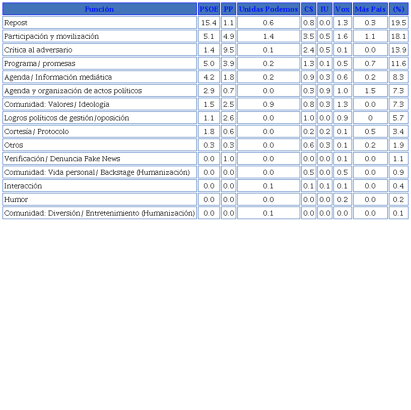 In fourth place, the parties use Telegram to viralize their interventions in the legacy media (10.3%) (Table 6). Once again, the PSOE stands out from the rest of the parties as it is the one that publishes the most on this topic (4.9%) (Table 6).