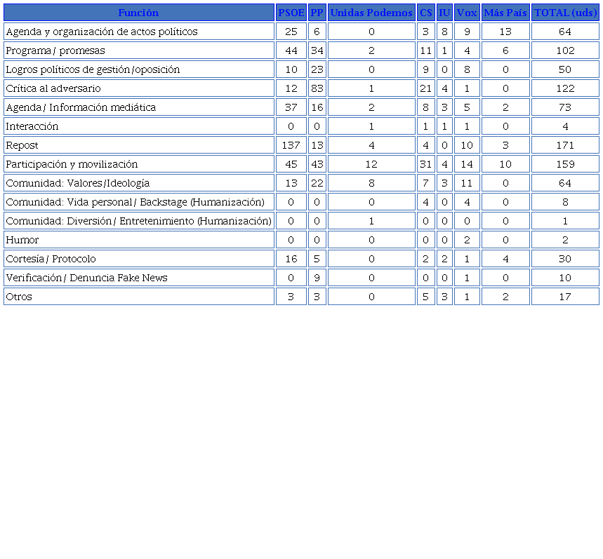 The rest of the analyzed functions present low values. This is the case of publications related to questions of courtesy and protocol (3.4%) (Table 5). Messages that verify or denounce hoaxes or false news (1.1%) do not have a significant presence either (Table 3). Although fact-checkers employ mobile instant messaging services with this function, political parties do not use them in their communication campaign strategies for this purpose. It is also detected that the communication strategies of the parties on Telegram avoid encouraging the personalization of politicians since messages related to personal life (0.9%), humour (0.2%) or entertainment (0.1%) (Table 5) are practically non-existent. Given the marginal levels of the use of these functions, there are no notable differences between the parties.