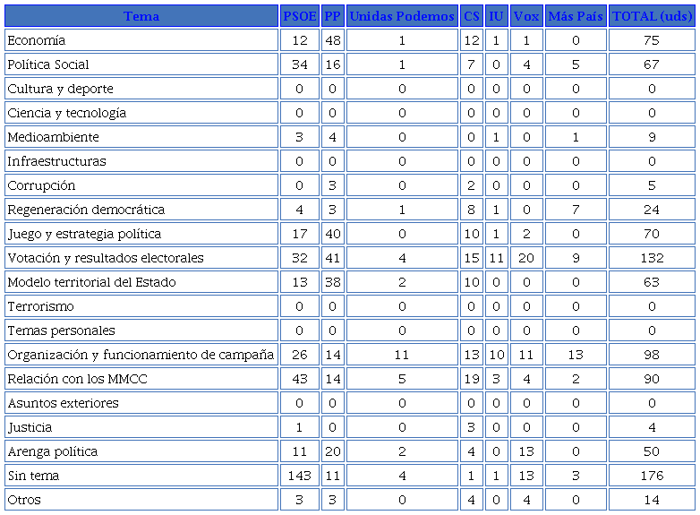 Finally, the parties have not used several themes during the electoral campaign on Telegram. These are culture, sports, science, infrastructure, foreign affairs or personal issues of the leaders. This last case reveals the absence of political personalization in this application. On Telegram, Political parties focus their thematic speech on topics directly related to the campaign and refuse to broadcast personal or private aspects of their candidates or other party members.