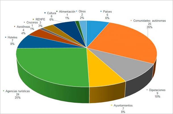 La publicidad de destinos provinciales es superior a la de ciudades, con algunos casos de colaboración institucional entre ayuntamientos y diputaciones. Ambas representan un 18% del total de la muestra analizada. Es importante señalar que, en gran parte de los anuncios de carácter público, aparece la marca que identifica la aportación de fondos europeos para el desarrollo económico, evidenciando en estas actuaciones un marcado carácter apoyo a los destinos turísticos correspondientes. Una evidencia es la continuidad de un eslogan de campaña a partir del que se desarrollan diferentes piezas, evidencia de una estrategia promocional planificada. Por último, no hay una presencia destacada de pequeños anunciantes, indicativo de los problemas económicos y de reducción de la actividad durante 2020 en el sector.