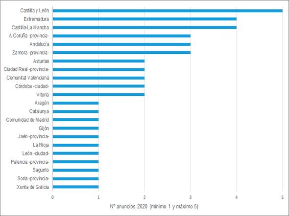 El análisis de la publicidad realizada por parte de instituciones públicas permite también un estudio de los destinos promocionados (Figura 3). Se trata de 43 anuncios si se excluyen las 4 páginas de países: Austria, Corea, Polonia y Portugal. Otros destinos internacionales tienen una mayor presencia en el reclamo publicitario de agencias y cruceros, como destinos asociados a la oferta de este tipo de anuncios. En los destinos españoles, la comunidad autónoma que más anuncios publicó en El País durante 2020, en los días analizados, con 5 impactos, fue Castilla y León, centrada con más intensidad desde verano en el reforzamiento de la idea de naturaleza, con la campaña “Inspira”, asociada a la idea de medio ambiente y libertad, una línea que han seguido otros organismos autonómicos o provinciales, como Castilla-La Mancha, Andalucía o A Coruña y Vitoria Gastéiz, entre otros ejemplos. La frecuencia de 4 impactos por parte de Castilla La-Mancha y Extremadura indica el desarrollo de una campaña sostenida en el tiempo, de igual forma que Andalucía, Asturias o la provincia de Zamora, que publicaron 3 anuncios en el suplemento analizado. Destaca, además, la variedad de destinos con dos anuncios o solo uno a lo largo de 2020, en casos como la Comunidad Valenciana, Córdoba capital, Gijón o Sagunto, por mencionar algunos ejemplos. Otras localidades de diferente dimensión, como Almería, Elche, Ourense, Cullera o Mojácar, se publicitan como destino en los anuncios de agencias y otras empresas privadas.