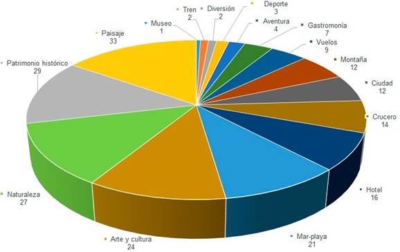 La insuficiencia de antecedentes para un análisis de estas características ha hecho imposible partir de unas categorías preestablecidas, si bien existen antecedentes de interés en investigaciones como Novo Espinosa de los Monteros et al. (2013), centrada en la semántica de la publicidad turística, con algunos elementos comunes con el instrumento aplicado en esta investigación, como el uso de elementos narrativos específicos, en el caso del espacio en la escena visual representada. De igual forma, otros trabajos inciden en la estrategia creativa mediante el estudio de caso de una comunidad autónoma (Alonso González et al., 2008. También existen antecedentes del estudio de los destinos turísticos desde la perspectiva del marketing (Alfaro de la Cruz, 2020). Sin embargo, se ha visto conveniente el diseño de una ficha de análisis específica, ad hoc. El listado de categorías se ha desarrollado, de forma fundamentada, a partir del propio estudio, tal y como se recoge en la tabla 1. No ha habido, por tanto, variables de aplicación contrastada, como propuesta de venta, escenarios o acciones. A lo largo del análisis, se ha asignado cada anuncio a un mínimo de una y un máximo de tres categorías. Por ejemplo, es habitual que la naturaleza como eje principal de campaña esté vinculada al paisaje, pero no siempre es el eje central de los anuncios relacionados con mar o playa. De igual forma, arte y cultura son contenidos relacionados con patrimonio histórico en la mayoría de los casos y, por ello, el anuncio ha sido contabilizado para todas y cada una de esas categorías. Otros, por su parte, son anuncios con una estricta función comercial, como los asignados a vuelos, tren u hotel. Se trata, por tanto, de categorías no excluyentes que responden al criterio asignado a lo largo de la investigación.