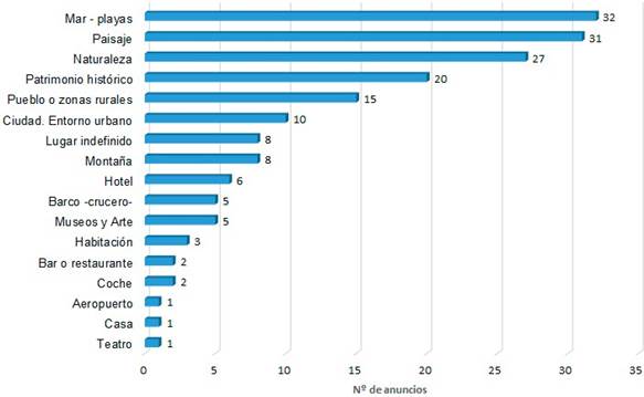 El escenario o lugar en el que se desarrollan las acciones descritas (Figura 6) ofrece algunas claves del análisis. A lo largo del estudio, se ha realizado un listado de lugares genéricos, no concretos, de forma que el registro de este elemento espacial del relato se convierta en un indicador de la coherencia con el reclamo o proposición de venta, así como las acciones realizadas por las personas que aparecen en las campañas turísticas. Se trata de una serie de contextos que representan la clave estratégica de cada anuncio, ya que, realmente, se trata del principal producto promocionado en las campañas, como es el destino promocionado. Sucede, incluso, en los anuncios de RENFE o Iberia, que proponen el propio tren o avión como espacio deseado, aunque sea un medio para llegar al destino final.