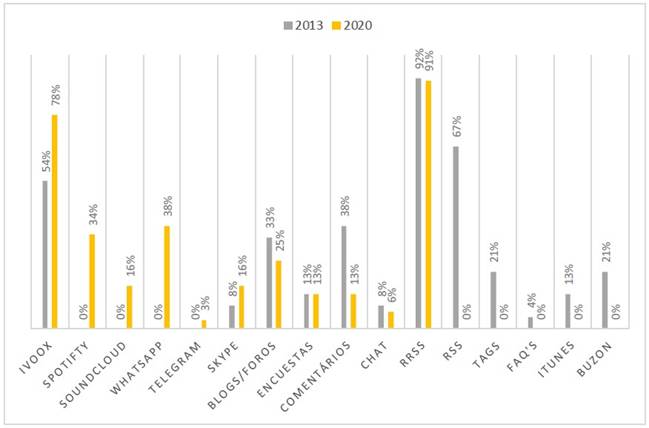Un punto que destacar en la apropiación tecnológica es el uso de podcasts y agregadores de audio, como iVoox (del 54% en 2013 al 78% en 2021) y la incorporación de Spotify (34%) y SoundCloud (16%). En paralelo, observamos que la presencia de las emisoras de radio en iTunes, que era del 13% en 2013, no existe en 2021. Para entender estos datos, es importante mirar el contexto que escapa a las emisoras universitarias españolas. En 2019, Apple inició el proceso de sustitución de iTunes por Apple Podcasts. Si bien esto no fue mencionado por las radios en la segunda encuesta, la reciente transición afecta al lugar que ocupa la plataforma en la ecología mediática y en la vida cotidiana de las emisoras.