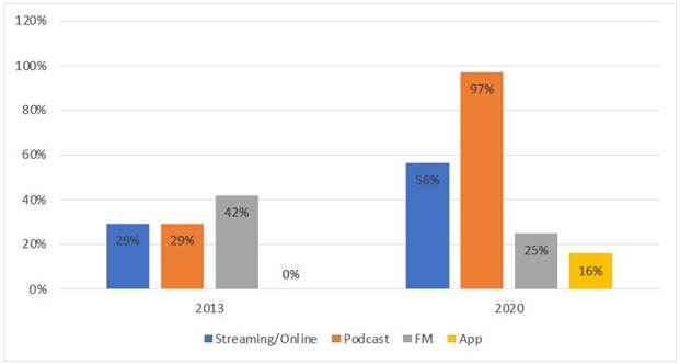 A finales de la década de 2021, también observamos un crecimiento en el consumo de audio, con especial atención a los podcasts. Según el estudio The Infinite Dial (2021), el 62% de los estadounidenses consume audio en línea. Los datos de consumo crecen año a año, con énfasis en la última década. En 2021, los encuestados pasaron un promedio de 16 horas y 14 minutos por semana escuchando audio en línea. En España, según la Asociación para la Investigación de los Medios de Comunicación, la radio tiene penetración en el 54,6% de la población en 2021 y el consumo de audio por internet creció un 38,7% en ese periodo, dato reiterado por el Estudio General de los Medios en España en 2022 (AIMC 2022) Además, según el informe de Digital News Report 2022 (Reuters Institute), cuatro de cada diez internautas españoles escuchan podcast (41%) situándose por encima de la media del resto de países analizados. Esto repercute en la emisión de contenidos radiofónicos, llegando a nuevas audiencias y diversificando las dinámicas de circulación de los contenidos, exigiendo un nuevo punto de vista sobre los contenidos producidos y emitidos por los mismos. La diversidad de sistemas de emisión, característica de la sociedad de plataformas, se puede observar en los cambios de estrategias de transmisión de las radios universitarias (Gráfico 2), con énfasis en el crecimiento de los podcasts y del streaming y en el inicio de la emisión por aplicaciones.