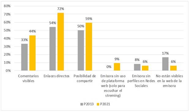 El debate sobre la adaptación a gramáticas y affordances se aplica a las plataformas, pero también a las redes sociales. Los datos demuestran una alta integración formal entre los espacios donde están presentes las emisoras, pero poco impacto en la construcción narrativa. La presencia en las redes sociales es alta. Solo el 6% de las estaciones no tiene perfil y en el 94% de ellos hay un enlace a las redes en las páginas oficiales de la radio. Asimismo, el 59% de ellas permite compartir contenidos, el 44% tiene comentarios abiertos y el 72% tiene enlaces a la página de la radio en sus redes. Como se muestra en el gráfico 3, hubo una evolución en estos datos en los dos períodos analizados.