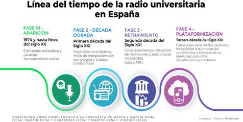Después de estos primeros acercamientos universidad-radio y siguiendo a varios autores podemos señalar que son tres las etapas de evolución de radio universitaria en España (Marta y Martín-Pena, 2014; Martín-Pena y Contreras, 2014). Vamos a analizar cada una de estas fases para poder entender la evolución e innovación que estas emisoras han ido asumiendo para intentar fortalecer su presencia en el panorama radiofónico nacional y su acercamiento a las audiencias.