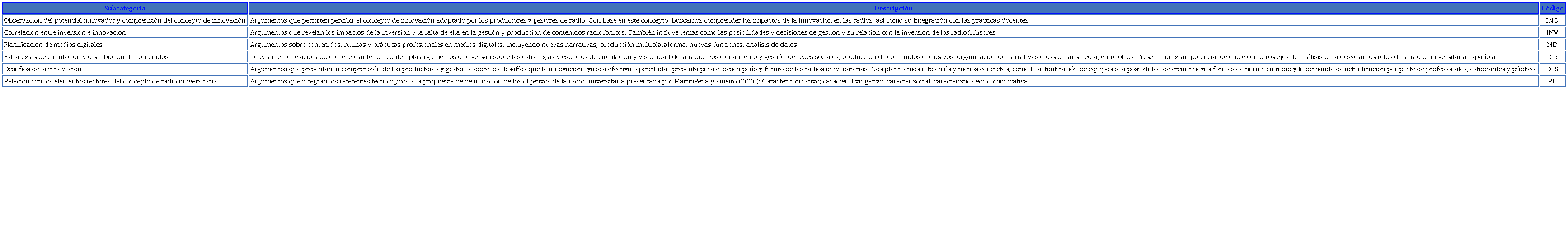 En este artículo analizamos las respuestas relacionadas directa o indirectamente con la categoría que definimos en la codificación como “innovación y tecnología”, asociada a ejes complementarios, presentados aquí como subcategorías. Las acciones de codificación y análisis se realizaron a través de un estudio cualitativo apoyado en el software NVivo. En este punto de la investigación, enumeramos argumentos que permiten “[...] asignar significados a cada dato individual para fines posteriores de detección de patrones, categorización, afirmación o desarrollo de proposiciones, construcción de teorías y otros procesos analíticos” (Saldaña, 2016, p.4). Como indica el autor, no es una ciencia precisa, sino un acto interpretativo que permite resumir, refinar o condensar datos. No se trata pues de reducir, sino de ordenar y, a partir de ello, observar los datos a partir de criterios que de ellos se desprenden.
