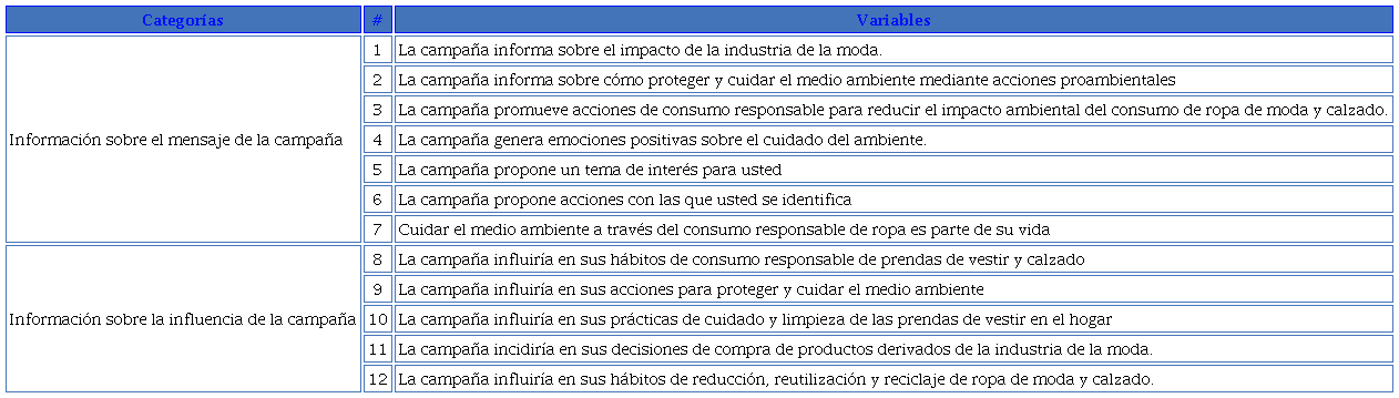 Así, de acuerdo con la investigación exploratoria documental y resultados cualitativos establecidos en estudios previos (Palacios et al., 2021), se estructuró un instrumento que indagó sobre variables demográficas como edad, género, nivel socioeconómico (NSE) y 12 variables categóricas para ana- lizar actitudes y percepciones sobre la información sobre el mensaje e información sobre influencia de la campaña de comunicación para el consumo responsable de productos de la industria de la moda; estas variables fueron medidas a través de escalas de Likert de cinco puntos que van de 1: Total desacuerdo a 5: Total acuerdo. Este instrumento fue validado por medio de juicio de expertos y obtuvo una confiabilidad interna de .89 (Alpha de Cronbach). Las categorías y variables aborda- das en el instrumento que, luego fueron aplicadas por medio de encuesta estructurada, fueron las siguientes: