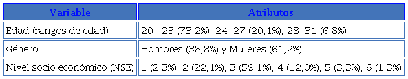 La muestra poblacional fue seleccionada teniendo en cuenta que los millennials son las personas naci- das entre 1981 y 2000 (Ladhari et al, 2019; Cabigiosu, 2020). En Colombia esta población asciende a cerca de 12 millones, lo que representa el 23% de los habitantes del país (DANE, 2020). En este sentido, para tener una muestra representativa con un nivel de confianza =95% y margen de error=5%, fueron necesarios 384 individuos (Morales, 2012; Ritchey, 2008). De acuerdo con los objetivos del estudio, se hizo un muestreo por conveniencia y sujetos tipo (Hernández-Sampieri & Mendoza, 2018; Creswell, 2013), aplicando el instrumento a 399 personas, residentes en Colombia (38,8% hombres y 61,2 % mujeres), con edades entre los 20 y 31 años. La muestra se conformó por rangos de edad, género y nivel socio económico (Tabla 2), siendo la edad el principal criterio de selección de los participantes.