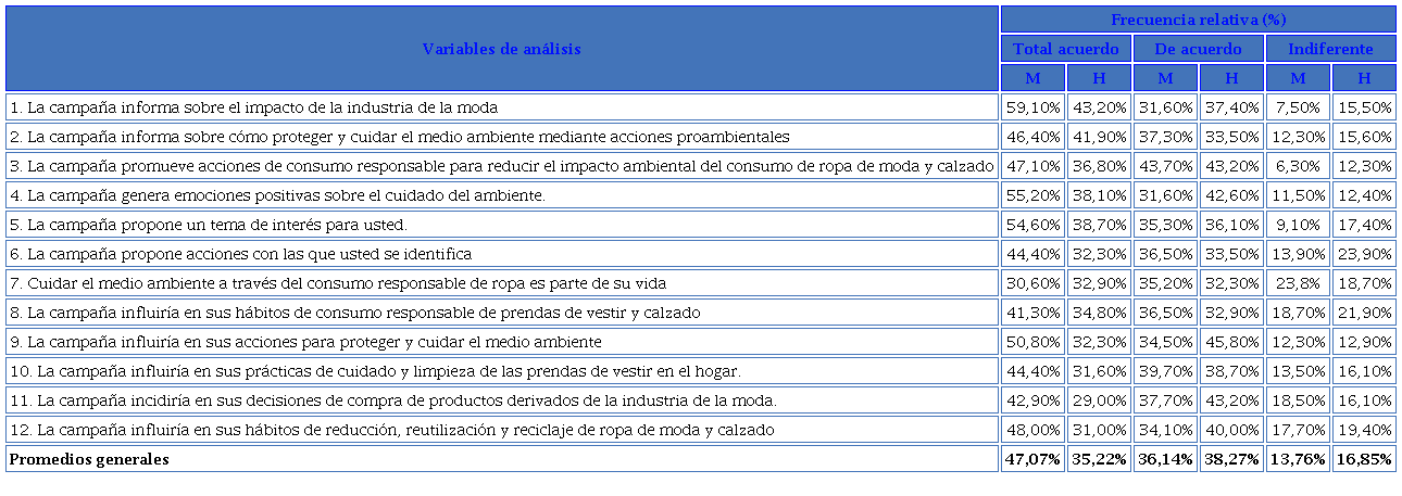 Al respecto, se destacan los ítems en los cuales las mujeres expresaron mayor indiferencia (ver tabla 3): 7. Cuidar el medio ambiente a través del consumo responsable de ropa es parte de su vida (23,8%); 11. La campaña incidiría en sus decisiones de compra de productos derivados de la industria de la moda (18,50%); 12. La campaña influiría en sus hábitos de reducción, reutilización y reciclaje de ropa de moda y calzado (17,70%). Se observa que la posible influencia de la campaña no necesariamente determina nuevos hábitos de uso y consumo de productos de la industria de la moda; esto constata que, para el caso de las mujeres, si bien el mensaje cumple con su objetivo de comunicación, no necesariamente incidiría en el 100% de la población de mujeres respecto a cambiar hábitos de consumo.
