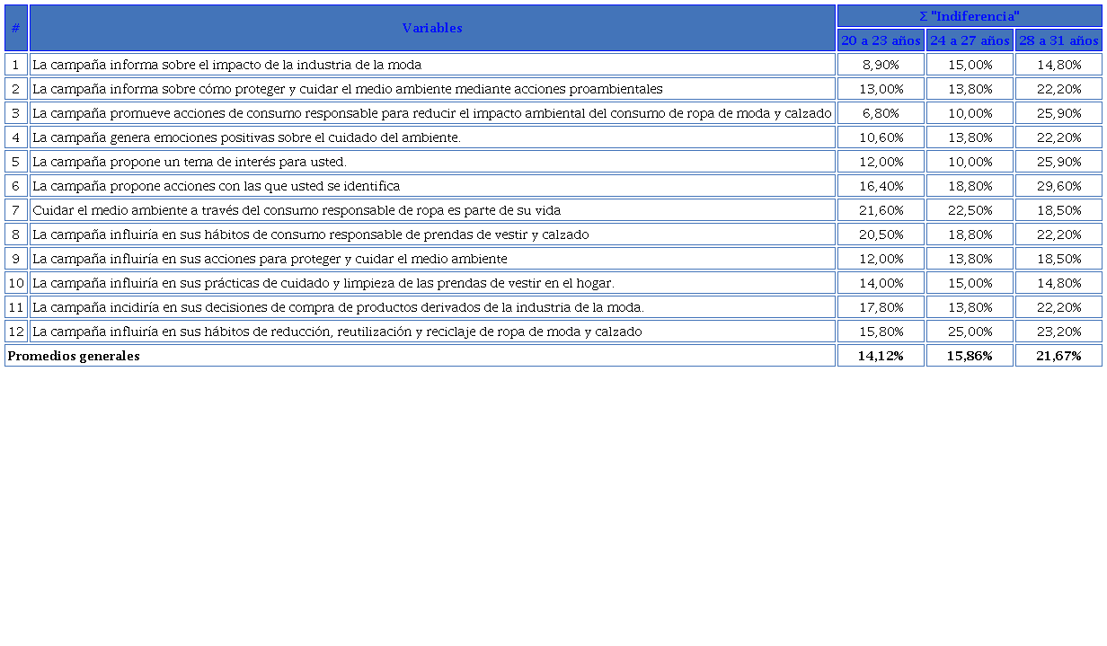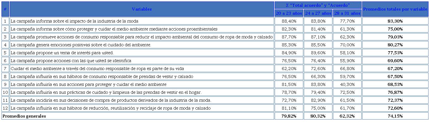 En lo que respecta a lo relacionado con la edad, en la tabla 4 se observa que independientemente de la edad, la mayoría de las personas encuestadas (74,15%) se encuentran en “Total acuerdo” y “De acuerdo” con cada una de las afirmaciones presentadas en torno a la campaña. No obstante, se halla un porcentaje considerable de personas entre los 28 a 31 años para quienes resulta menos relevante la campaña en comparación con los otros dos rangos de edad; el promedio de personas de dichas edades que respondieron entre “Total acuerdo” y “De acuerdo”, estuvo en 62,32%, lo que permite inferir que el restante estuvo inclinado a respuestas de “Indiferencia”. Este resultado evidencia que la percepción, la opinión y la credibilidad hacia este tipo de comunicación ecológica se relaciona con la edad, mostrando que las personas de mayor edad presentan opiniones menos favorables hacia este tipo de mensajes y mayor indiferencia frente al tema planteado en la campaña proambiental sobre consumo derivado de moda.