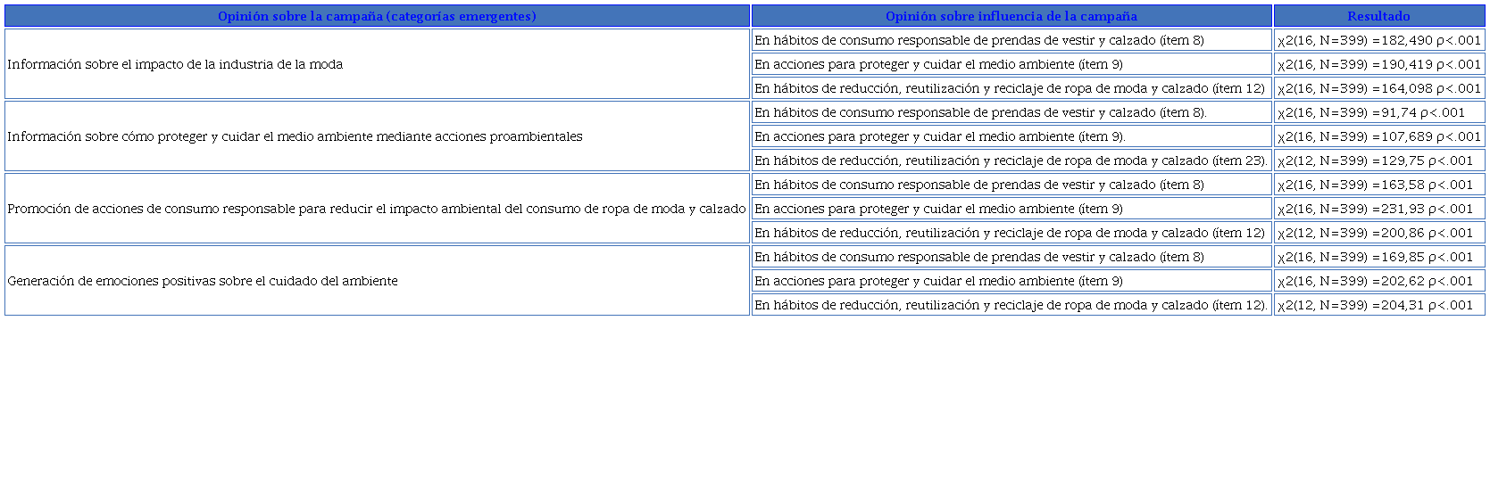 4. La campaña genera emociones positivas sobre el cuidado del ambiente. Respecto a la percepción de influencia de la campaña, se establecieron asociaciones significativas, principalmente, con los ítems: 8. La campaña influiría en sus hábitos de consumo responsable de prendas de vestir y calzado. 9. La campaña influiría en sus acciones para proteger y cuidar el medio ambiente. 12. La campaña influiría en sus hábitos de reducción, reutilización y reciclaje de ropa de moda y calzado. Según los resultados se constata que la opinión favorable en torno al mensaje promovido en la campaña puede tener influencia en el consumo responsable de ropa, en las acciones proambientales y en los hábitos sostenibles de reducción del uso, reutilización y desecho de prendas de vestir y calzado.