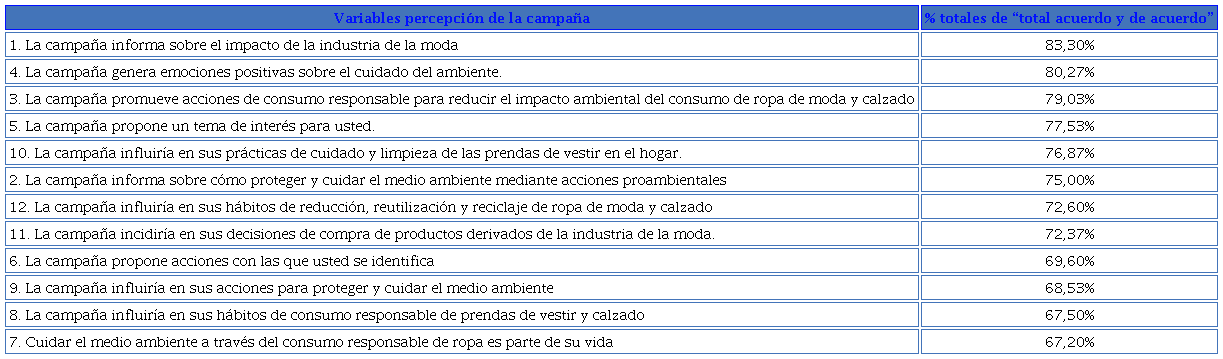 En lo que respecta a la percepción sobre la influencia de la campaña en las prácticas de cuidado y limpieza de ropa en el hogar y sobre los hábitos de reutilización y reciclaje de prendas de vestir se encuentra que la mayoría de las personas consultadas están de acuerdo con esta posible influen- cia (entre el 67,2% y 76,87%%); también están de acuerdo con los contenidos sobre protección y cuidado medioambiental a través del consumo sostenible y responsable de ropa promulgados en la campaña (79,03%). En este sentido, y en su totalidad se pudieron observar relaciones significativas entre estas variables (ρ =.0.).