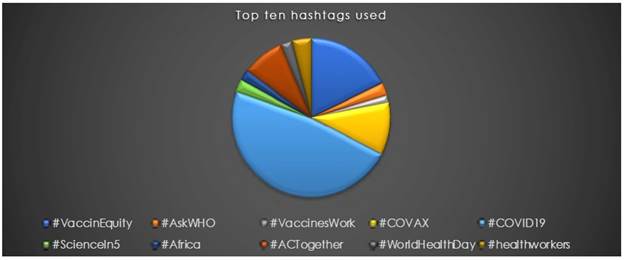 The most used hashtags (see Figure 3) are #COVID19 (used 203 times), #VaccinEquity (76), #COVAX (45), #ACTogether (36), #healthworkers (17), #AskWHO (11), #ScienceIn5 (also 11), #WorldHealthDay (10), #Africa (9), and #VaccinesWork (7). In addition, reference is made to #AstraZeneca (6), #WorldImmunizationWeek (5), #Ghana (also 5), #HealthEquity (3), and #Nigeria (3).