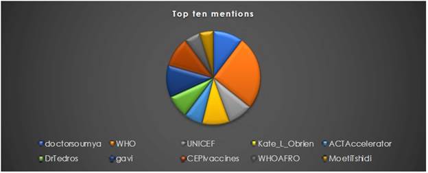 The most common mentions (see Figure 4) are to the WHO itself with the use of @WHO (32); to @gavi, Gavi, the Vaccine Alliance, (14), to @doctorsoumya, Chief Scientist of the WHO itself; to @CEPIvaccines (13), Coalition for Epidemic Preparedness Innovations; to @Kate_L_OBrien (12), WHO IVB Director; @UNICEF (11); @DrTredos, Director General of the WHO; @ACTAccelerator3 (8); @WHOAFRO (7), and @MoetiTshidi, WHO Regional Director for Africa. Additionally, @TwitterSpaces (4) and @GretaThunberg (3) are mentioned.