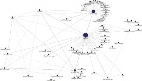 After elaborating the sociogram (see Figure 5), a clear central element (the protagonist of this paper) is observed and there are also three zones of density of differentiated and densely compact relationships: @WHO, @DrTedros, and @WHOAFRO. In addition, articulating elements are observed, which are not central but occupy a strategic position in this communication group due to their union with various actors in this communication network: @UNICEF, @Dr Tedros, @gavi, @CEPIvaccines, and @WHOAFRO. Finally, it is worth highlighting the communicative triangle that occurs between two prominent actors -@WHO and @DrTedros- and @ACTAccelerator.