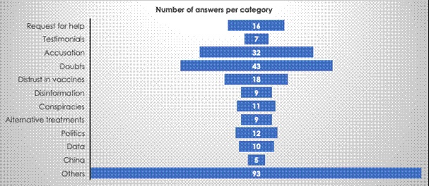 The messages that favor the dissemination of disinformation content hardly have a notable impact amongst the responses analyzed, reaching only 3.4% of the total. Another of the interesting groupings of categories that the results show is that 14.4% of the messages (38) show disbelief towards some aspect of the pandemic: 6.8% (18 messages) express distrust, skepticism, or opposition towards vaccinations; 4.2% (11 messages) relate the COVID-19 pandemic or vaccination against it to some conspiracy theory, and 3.4% (9 messages) question why some types of unapproved drugs or treatments against it are not used.