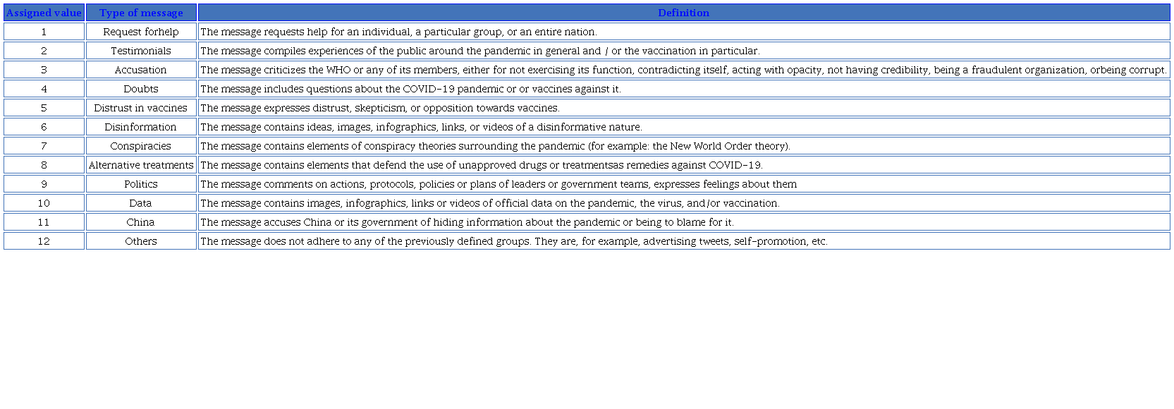 The 265 responses to the tweets analyzed, with the purpose of seeing what discourses the public of the WHO produces, have been grouped into 12 large thematic groups: Request for help, Testimonials, Accusation, Doubts, Distrust in vaccines, Disinformation, Conspiracies, Alternative treatments, Politics, Data, China, and Others. Table 2 shows the definition of said categories used when making the assignment during the fieldwork carried out.