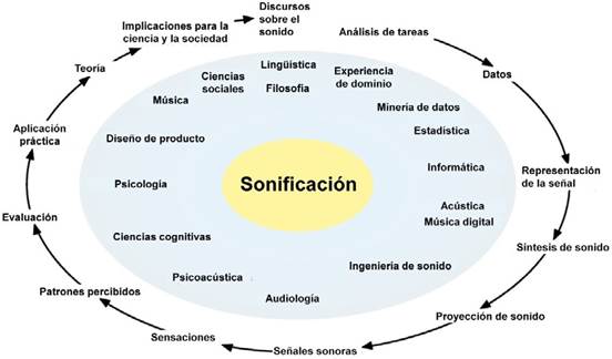 Tanto los trabajos más conceptuales como las aplicaciones prácticas de la sonorización muestran múltiples formas de entender qué es una sonificación, cuáles son sus características, que disciplinas podrían estar implicadas, y qué elementos han de tenerse en cuenta para crearlas. Un ejemplo de la interrelación entre disciplinas y técnicas relacionadas con la sonificación se muestra en la figura 1.