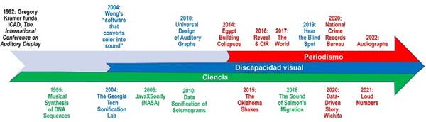 Las prácticas sobre sonificación aplicadas al periodismo están basadas fundamentalmente sobre las experiencias previas aplicadas en dos ámbitos inicialmente ajenos: la comunicación de datos científicos y la representación de conjuntos de datos para personas con discapacidad visual. La sonificación periodística, aún en sus primeros pasos, ha tratado de imitar ambas prácticas comunicativas, por lo que no puede entenderse sin ellas. Más aún, algunas de las sonificaciones que no han sido específicamente concebidas con fines periodísticos sí contienen elementos de actualidad informativa.