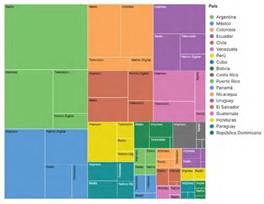 En la figura 1 mostramos una visión global de toda América Latina de habla hispana con sus 19 países a partir de los 2403 medios de comunicación identificados en nuestro estudio y clasificados en formatos ya sea impresos, televisión, radio o nativo digital. Cada color representa un país, y da cuenta de las dimensiones que estos poseen por de acuerdo al número medios de comunicación. La aportación de esta figura da cuenta de la relevancia que estos poseen respecto al contexto hispanoamericano, como dar cuenta de cuáles son los formatos que predominan por cada territorio.