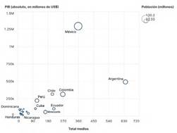 Con el fin de tener una idea relativa del tamaño y la importancia del sistema mediático de cada país, se ha completado el análisis con indicadores socioeconómicos. En términos generales los países grandes tienden a tener sistemas mediáticos más grandes y diversos, aunque cada uno con sus matices. Estos matices los podremos apreciar con indicadores básicos como la población total y el PBI, cuya fuente ha sido el Banco Mundial. En el caso de Venezuela, fue necesario otra fuente de datos8.