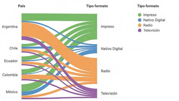 Si consideramos la diversidad de los formatos de medios de comunicación de los ecosistemas mediáticos como Argentina, México, Colombia, Ecuador y Chile, descubrimos que entre ellos no hay similitud e incluso presentan importantes sesgos. Diferentes tipologías de medios predominan, algunos con inclinación a la radio como otros con una composición clásica con mayoría de impresos. Hay atisbos de una posible irrupción de los nativos digitales, pero a una escala menor salvo excepciones. En ciertos contextos, se expresa con una mayor intensidad como es en México y Chile.