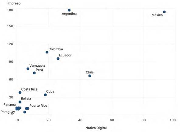 Argentina, México y Chile destacan en la comparación de países que en proporción tienen tanto medios impresos como nativos digitales. Estos países poseen un desarrollo de su ecosistema mediático diverso, siendo relevantes dentro del contexto regional con una alta capacidad de innovación.