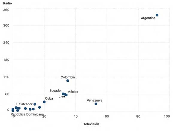 Es elocuente la notable presencia de las radios en Argentina, lo que la hace despegar respecto a dicho eje frente a los demás países, al igual que en el caso de la televisión. Argentina tiene una cantidad correlacionada de medios si se considera televisión y radio. Similar comportamiento podemos observar en los demás países, entre las que los índices son idénticos por ejemplo entre Ecuador, Chile y México.