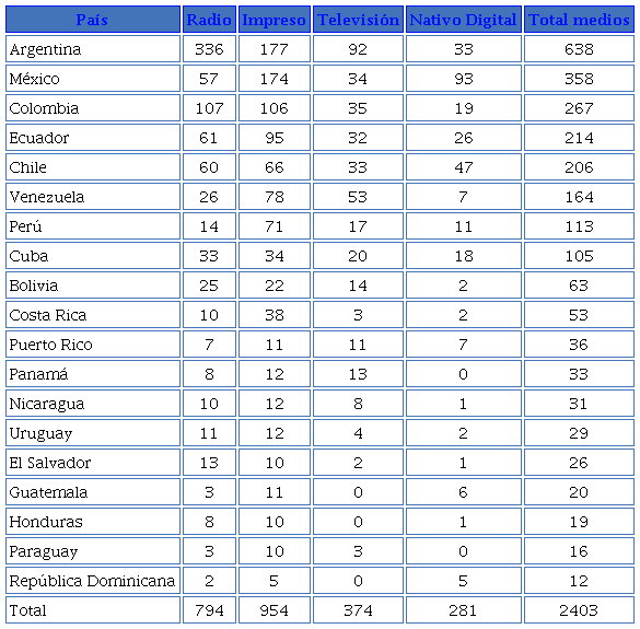 Entre todos los territorios destaca Argentina (verde claro) con más medios constatados por la academia al contener el 26,5%. Su ecosistema mediático es el más grande entre todos los países. La gran particularidad de dicho país es su enorme cantidad de radios al equivaler el 42,3% del espectro radiofónico hispanoamericano.