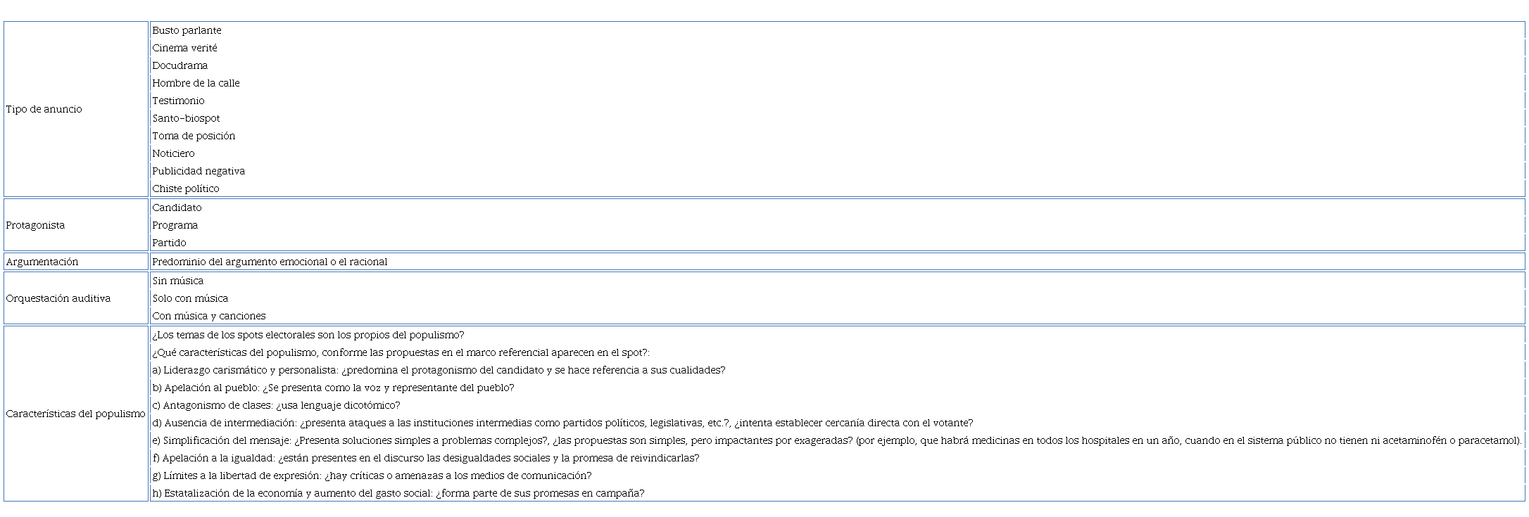 Para identificar el populismo en los spots electorales de las últimas contiendas políticas en Guatemala se adapta la propuesta de Sádaba (2003), que analiza: